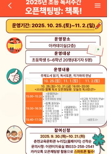 [뉴스노크=김인호 기자] 춘천교육문화관은 책 읽기 좋은 계절인 가을을 맞아 오는 10월 25일, 10월 28일부터 11월 2일까지 초등학생 5~6학년 학생 20명을 대상으로 초등 독서주간 ‘오픈책팅방 책톡!’을 운영한다.