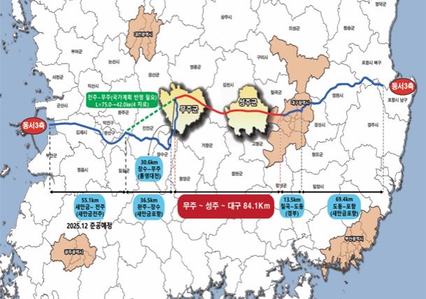 ‘무주~성주~대구 고속도로 건설사업’ 구간은 전북 무주군에서 경북 성주군을 거쳐 대구광역시로 이어지는 왕복 4차로로 총연장 84.1km이다. 고속도로와 일반도로(국도, 지방도)가 만나는 나들목 7곳, 고속도로와 고속도로를 연결하는 분기점 3곳을 포함하며 총사업비는 약 6조 4천억 원 규모다.