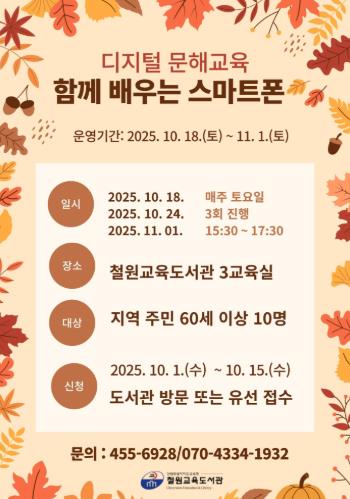 [뉴스노크=김인호 기자] 철원교육도서관은 지역 고령층의 디지털 활용 능력 향상과 격차 해소를 위해 오는 10월 18일부터 11월 1일까지 매주 토요일, 총 3회에 걸쳐 ‘함께 배우는 스마트폰’ 디지털 문해교육을 운영한다.