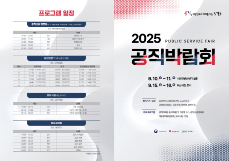 인사혁신처는 ‘2025 공직박람회’를 오는 11일까지 수원컨벤션센터와 오는 15~16일 부산시청에서 각각 개최한다고 10일 밝혔다.