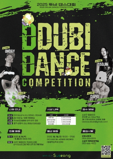 대회 관련 사항은 수성구 누리집(홈페이지) 공고문과 뚜비 댄스대회 공식 인스타그램 계정에서 확인할 수 있다.