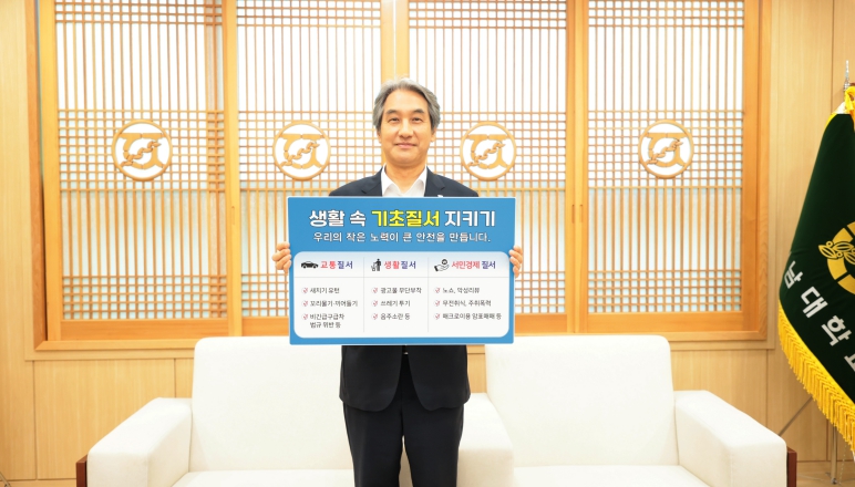 29일 전남대에 따르면, 이 총장은 이날 본부 5층 집무실에서 ‘우리의 작은 노력이 큰 안전을 만듭니다’라는 문구가 적힌 피켓을 들고 생활 속 기초질서 지키기 챌린지에 동참했다. 피켓에는 교통질서(새치기 유턴, 꼬리물기·끼어들기, 비긴급 구급차 법규 위반), 생활질서(광고물 무단부착, 쓰레기 투기, 음주소란 등), 서민경제 질서(노쇼·악성리뷰, 무전취식·주취폭력, 매크로이용 암표 예매 등)가 안내됐다.