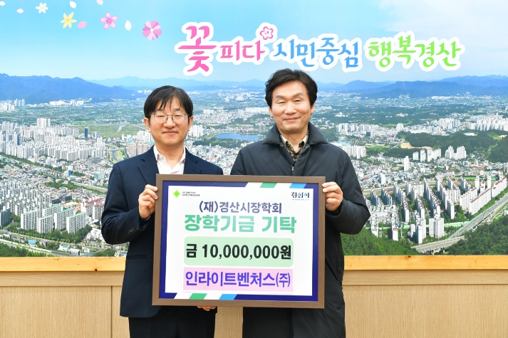 인라이트벤처스㈜ 박문수 대표이사는 “지역에 기반을 둔 투자사로서 지역사회의 미래 성장에 보탬이 됐으면 하는 마음으로 장학금 기탁을 결정했다”며, “경산의 학생·청년들이 장래에 혁신 역량을 갖춘 인재로 성장하는 데 도움이 되기를 바란다”고 전했다.