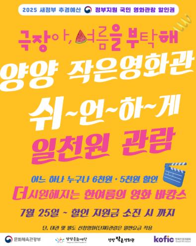 [뉴스노크=김인호 기자] (재)양양문화재단은 문화체육관광부와 영화진흥위원회에서 추진하는 '2025 국민 영화관람 활성화 지원사업'에 지원하여 참여 영화관으로 선정됐다.