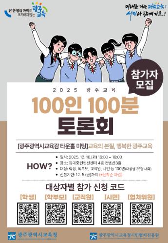 [뉴스노크=김인호 기자] 광주시교육청시민협치진흥원은 오는 12월 16일 김대중컨벤션센터 4층 컨벤션홀에서 ‘2025 광주교육 100인 100분 토론회’를 개최한다.