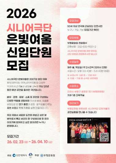 [뉴스노크=김인호 기자] 부평구 부평문화원은 23일부터 4월 10일까지 50세 이상을 대상으로 시니어극단 ‘은빛여울’의 신규 단원을 모집한다고 밝혔다.