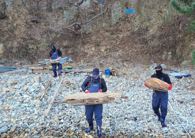 [뉴스노크=김인호 기자] 울산 동구는 2월 20일 오전 대왕암공원 출렁다리 밑 해안 일대에서 해양쓰레기를 수거하는 해안 정비 활동을 했다.