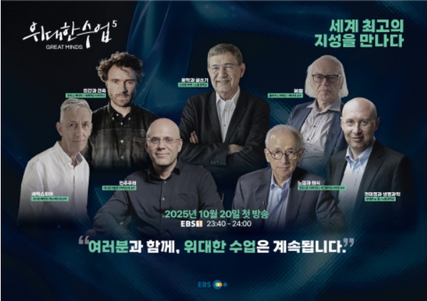 EBS ‘위대한 수업, 그레이트 마인즈’ 시즌5는 10월 20일(월)부터 평일 밤 11시 40분 EBS 1TV에서 방송되며, EBS 홈페이지에서 다시 볼 수 있다.