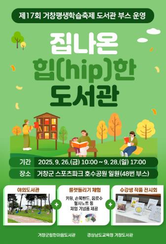 [뉴스노크=김인호 기자] 거창군립한마음도서관과 경상남도교육청 거창도서관은 오는 26일부터 28일까지 3일간 거창군 스포츠파크 일원에서 개최되는 제17회 거창평생학습축제 동안 『집나온 힙(hip)한 도서관』 부스를 운영한다고 밝혔다.