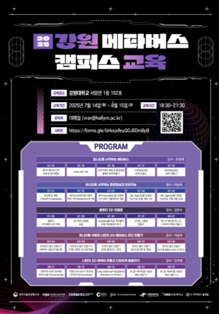 이번 교육은 메타버스 관련 재직자, 취업준비생, 대학생을 대상으로 무료로 운영되며, 강원 메타버스 지원센터 홈페이지를 통해 구글폼으로 접수 가능하다. 프로그램은 유니티로 시작하는 메타버스 ▲ 유니티로 시작하는 증강현실과 인공지능 ▲ 블렌더 3D 모델링 ▲ 유니티를 이용한 나만의 2D 메타버스 공간 만들기 ▲ 나만의 3D 캐릭터 만들고 다양하게 활용하기로 구성된다.