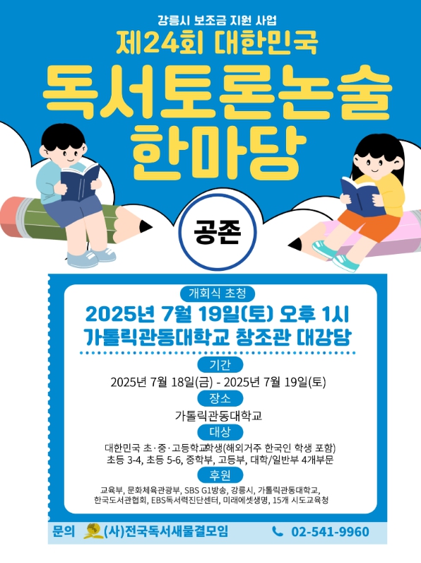 [뉴스노크=김인호 기자] 강릉시와 교육부, 문화체육관광부 등이 후원하고 (사)전국독서새물결모임이 주최하는 제24회 대한민국 독서토론·논술대회가 오는 7월18일 금요일부터 19일 토요일까지 양일간 강릉에서 개최된다.