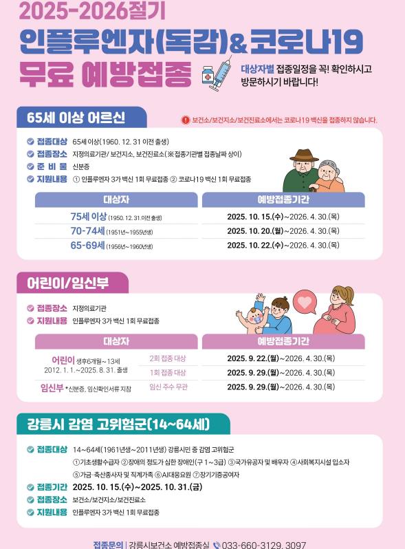 [뉴스노크=김인호 기자] 강릉시는 겨울철 호흡기 감염병 예방을 위해 오는 9월 22일부터 2025-2026절기 독감 및 코로나19 무료 예방접종을 실시한다고 밝혔다.