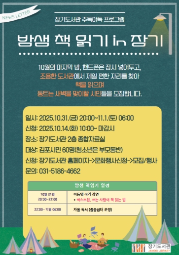 이번 프로그램은 이동영 작가의 '텍스트힙, 쓰는 사람이 책 읽는 법' 강연을 시작으로 '독서를 하는 이유?' '독서 습관 만드는 법!' '명사들의 책 읽는 법'을 소개하며 어떻게 잘 읽을 것인가에 대해 이야기를 나눈다. 강연 후 장기도서관 종합자료실로 이동해 밤새 책 읽기를 진행한다. 책 읽는 중간 간단한 스트레칭을 할 수 있는 공간과 졸음 쉼터를 마련해 밤샘 책 읽기를 더욱 응원한다.