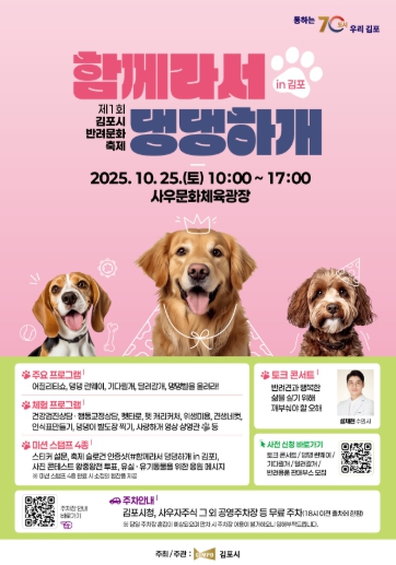 [뉴스노크=김인호 기자] 김포시는 반려동물과 시민이 함께하는 문화의 장인 제1회 김포시 반려문화축제 '함께라서 댕댕하개 in 김포'가 오는 10월 25일 사우문화체육광장(사우동)에서 개최된다고 밝혔다.
