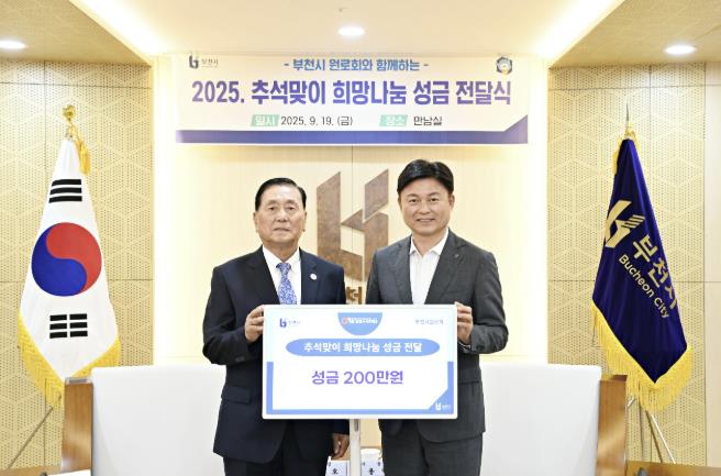 [뉴스노크=김인호 기자] 부천시는 지난 19일 부천시청 만남실에서 부천시 원로회가 추석을 앞두고 희망나눔 성금 200만 원을 전달했다고 밝혔다. 전달식에는 조용익 부천시장이 참석해 지역사회 나눔에 앞장서는 원로회에 감사의 뜻을 표했다.