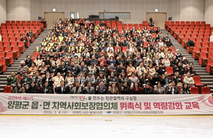 [뉴스노크=김인호 기자] 양평군은 지난 4일 양평도서관 물빛극장에서 250여 명이 참석한 가운데 ‘2026년 제11기 읍면 지역사회보장협의체 위촉식 및 역량 강화 교육’을 개최하고, 지역 맞춤형 복지안전망 강화를 위한 본격적인 활동에 들어갔다고 밝혔다.