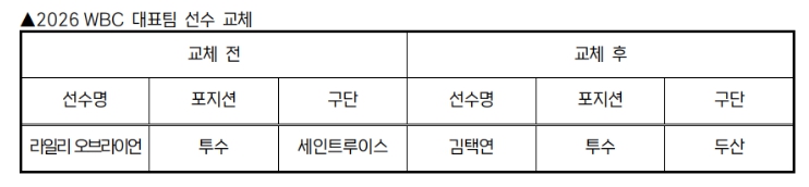 [뉴스노크=김인호 기자] KBO 전력강화위원회는 부상으로 인해 WBC 참가가 어려워진 세인트루이스 라일리 오브라이언을 대체할 선수로 두산 김택연을 확정하고 WBC 조직위에 선수 교체 승인을 요청했다.
