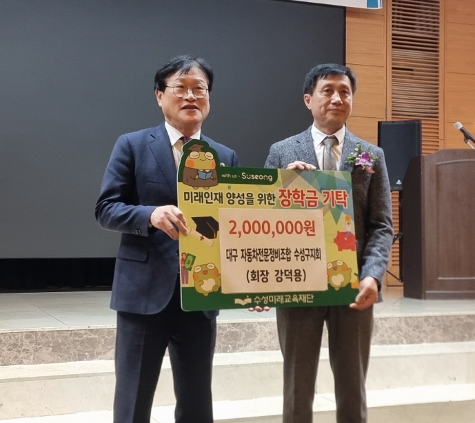 | ▲ 대구자동차전문정비사업조합 수성구지회(회장 강덕용)는 지난 22일 호텔 라온제나에서 2026년 신년회를 개최하고, 지역 교육 발전을 위해 장학금 200만 원을 수성미래교육재단에 기탁했다. |