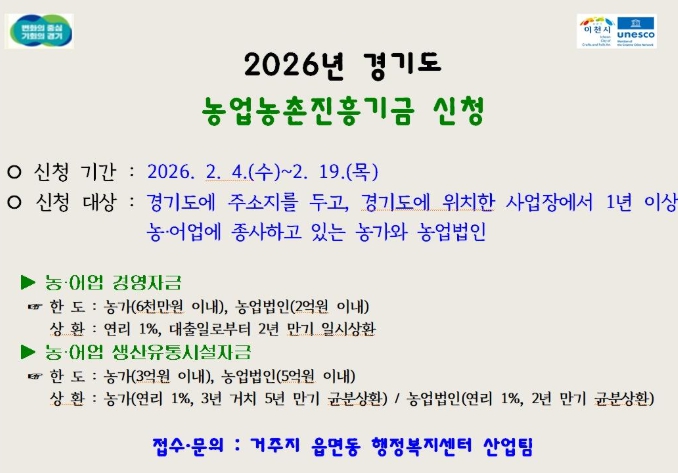 [뉴스노크=김인호 기자] 이천시는 농업인에게 장기·저리 융자 지원을 실시하고 경영안정을 돕기 위해 2026년 경기도 농업농촌진흥기금 농어업 경영자금, 농어업 생산유통시설자금 사업에 대한 신청을 2월 3일부터 접수한다.