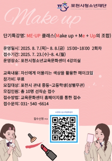 [뉴스노크=김인호 기자] 포천시청소년재단 청소년교육문화센터는 오는 8월 7일부터 8일까지 이틀동안 중·고등학생을 대상으로 화장법을 배우는 ‘ME-UP 클래스’를 운영한다.