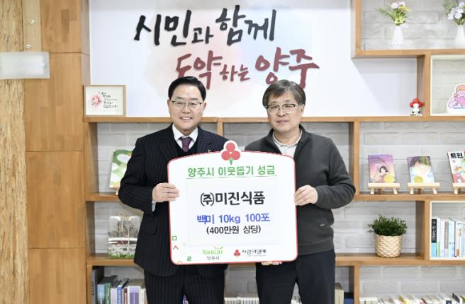 [뉴스노크=김인호 기자] 양주시는 최근 ㈜미진식품로부터 이웃돕기 성품으로 백미 10kg 100포(400만 원 상당)를 기탁받았다고 밝혔다.