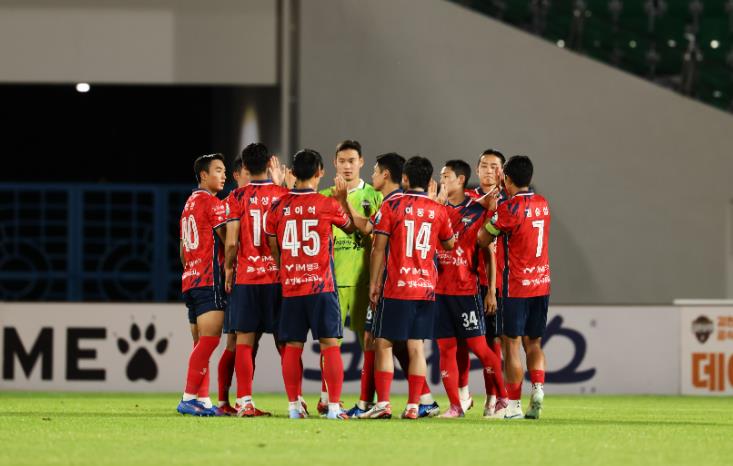 ▲ 7월 26일 제주전에서 김천상무 선수들이 파이팅을 하고 있다 |