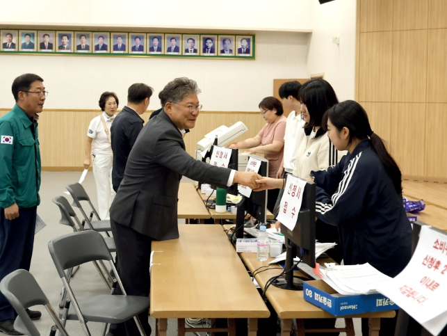 [뉴스노크=김인호 기자] 영광군 장세일 군수는 7월 22일, 지역 주민들의 “민생회복 소비쿠폰” 신청이 진행 중인 영광읍사무소를 찾아 현장점검과 소비쿠폰 지급업무에 힘쓰는 관계자 등을 격려하고, 현장에서 신청 중인 군민들과 직접 소통하는 시간을 가졌다.