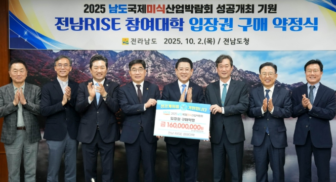 [뉴스노크=김인호 기자] 전라남도는 2일 도청 접견실에서 전남RISE 참여대학 총장단과 함께 ‘2025 남도국제미식산업박람회 입장권 구매 약정식’을 개최했다.