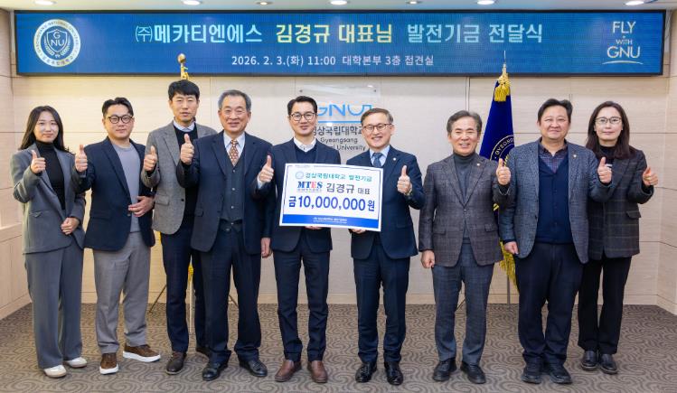 [뉴스노크=김인호 기자] 경상국립대학교는 2월 3일 오전 11시 대학본부 3층 접견실에서 ㈜메카티엔에스 김경규 대표가 대학발전기금 1000만 원을 기부했다고 밝혔다.