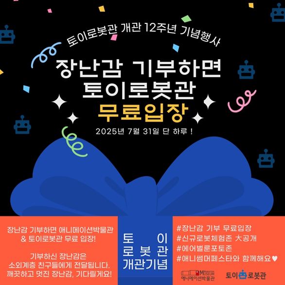 이번 개관행사는‘로봇과 함께한 12년, 함께 나누는 여름’을 주제로 ▲토이로봇관 오픈데이:장난감 나눔데이 ▲토이로봇관 신규 체험 콘텐츠 ‘Robot Dog, 내 손안의 미래 기술’▲ 2025 애니썸머페스타 등 다양한 체험 프로그램이 구성된다.