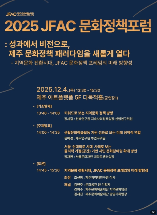 [뉴스노크=김인호 기자] 제주문화예술재단(이사장 김석윤)은 '다시 심는 성과, 피어나는 비전'이라는 슬로건으로 '2025년 재단 성과공유주간(이하 성과공유주간)'을 개최한다. 프로그램은 제주아트플랫폼(5층)에서 12월 4일부터 6일까지 3일간 진행된다.