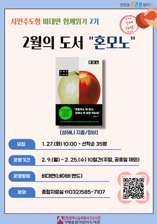 [뉴스노크=김인호 기자] 인천광역시교육청서구도서관은 ‘2026년 시민주도형 비대면 함께읽기’ 2기 프로그램으로, ‘혼모노’ 함께 읽기를 2월 9일부터 2월 25일까지 운영한다.