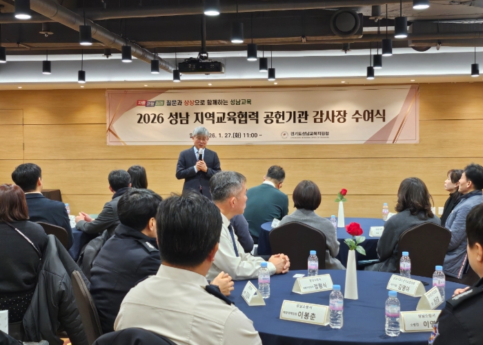 [뉴스노크=김인호 기자] 경기도성남교육지원청은 1월 27일 스카이파크 호텔에서 '성남 지역교육협력 공헌기관 감사장 수여식'을 개최하여 성남교육 발전을 위해 협력해 온 지역교육협력기관 22곳에 감사의 뜻을 전했다.
