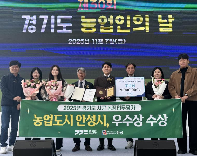 [뉴스노크=김인호 기자] 안성시가 2025년 경기도 시·군 농정업무 평가에서 우수 기관으로 선정되어 ‘우수상’을 수상했다. 지난해 ‘장려상’을 받은데 이어 올해는 한 단계 도약한 성과를 거두며, 지역 농정 추진 역량을 다시 한번 입증했다.