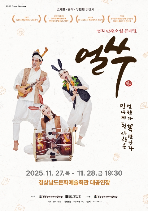 [뉴스노크=김인호 기자] 경남문화예술회관은 27~28일 양일간 오후 7시 30분 대공연장에서 국립아시아문화전당재단 제작한 뮤지컬 쿵짝 두번째 이야기 – 얼쑤 공연을 개최한다고 밝혔다.