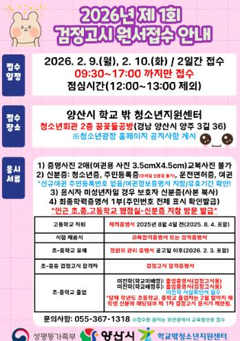 [뉴스노크=김인호 기자] 양산시 학교 밖 청소년지원센터는 학교 밖 청소년들의 2026년 제1회 검정고시 응시를 지원하기 위해 대리 원서접수처를 운영한다.
