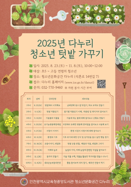 [뉴스노크=김인호 기자] 인천광역시교육청중앙도서관 청소년문화공간 다누리는 청소년의 기후 위기 인식 제고와 생태 전환 교육을 위한 ‘2025년 다누리 청소년 텃밭 가꾸기’ 프로그램을 운영한다.