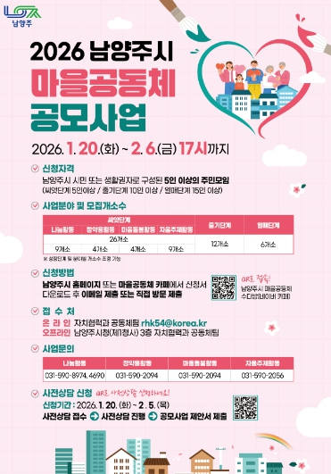 [뉴스노크=김인호 기자] 남양주시는 1월 20일부터 2월 6일까지 ‘2026년 마을공동체 공모사업’참여 공동체를 공개 모집한다.