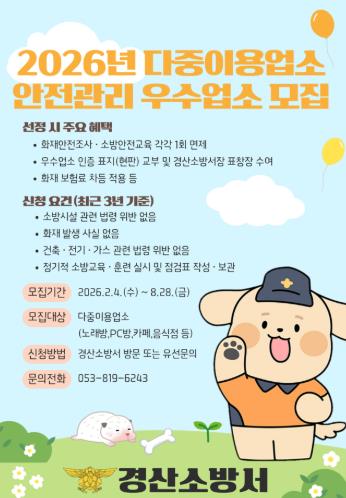 경산소방서, ‘2026년 다중이용업소 안전관리 우수업소’ 모집