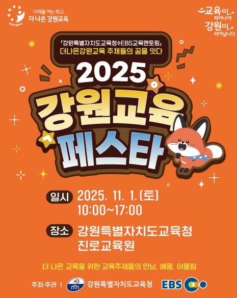 [뉴스노크=김인호 기자] 강원특별자치도교육청은 한국교육방송공사(EBS) 디지털교육기획부와 함께 11월 1일 강원특별자치도교육청진로교육원에서 ‘꿈을잇다+ 2025 강원교육페스타’를 개최한다.