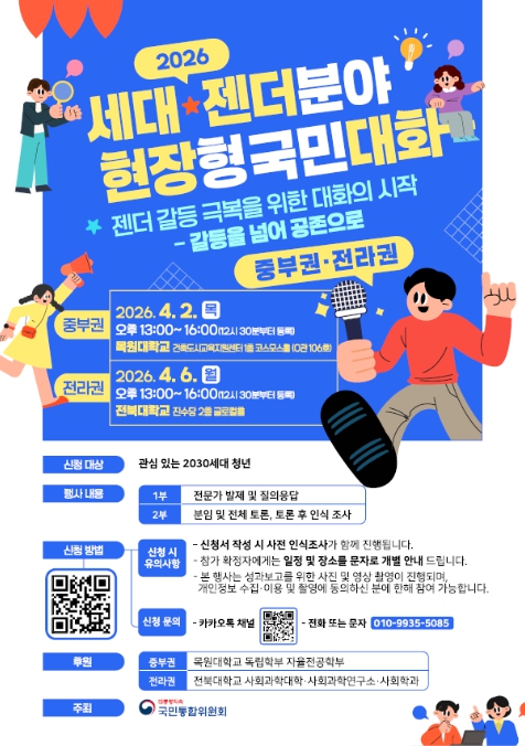 [뉴스노크=김인호 기자] 대통령직속 국민통합위원회는 4월 2일 오후 1시에 대전 목원대학교에서, 4월 6일 오후 1시에는 전주 전북대학교에서 ‘세대·젠더분야 권역별 현장형 국민대화’를 개최한다고 밝혔다.