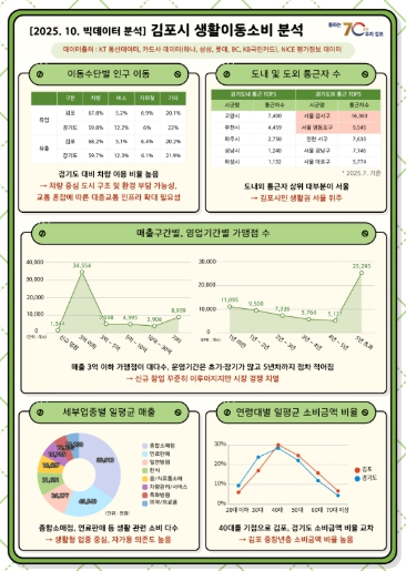 분석 결과, 김포시는 경기도 전역에 비해 차량 이용률이 높았으며, 출퇴근 역시 도내보다는 서울 방면의 도외 이동이 두드러진 것으로 나타났다. 이외에도 생활밀착형 업종의 일평균 매출 순위가 경기도보다 높았고, 40대 이상 연령층의 소비 비중이 경기도 평균을 상회했다.