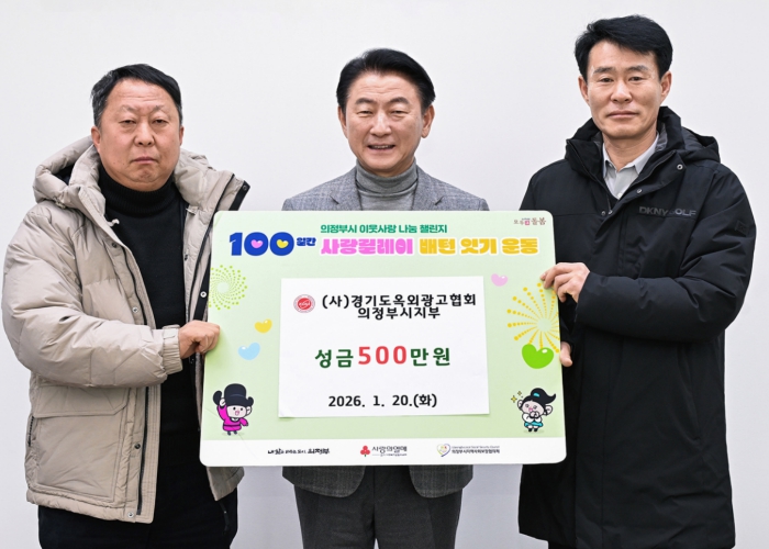 [뉴스노크=김인호 기자] 의정부시는 1월 20일 (사)경기도옥외광고협회 의정부시지부가 ‘100일간 사랑릴레이 배턴 잇기’에 동참해 성금 500만 원을 기탁했다고 밝혔다.