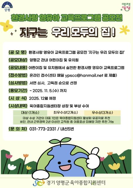 조연경 센터장은 “환경도시 양평의 미래를 함께 만들어갈 아이들에게 환경 감수성과 실천력을 길러주는 것이 매우 중요하다”며, “이번 공모전을 통해 양평형 우수 영유아 교육 프로그램의 발굴을 기대한다”고 전했다.