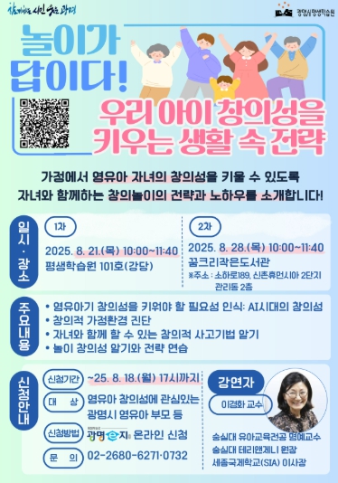 이번 프로그램은 ‘광명지식상점’ 기획 프로그램으로, 영유아기 창의성에 관심 있는 부모를 대상으로 한다.