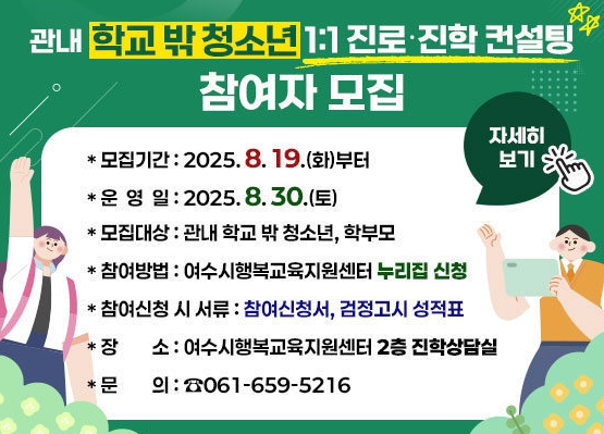 ▲ 여수시행복교육지원센터 ‘관내 학교 밖 청소년 1:1 진로‧진학 컨설팅‘ 포스터 |