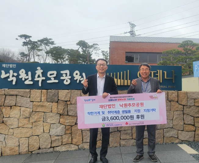 [뉴스노크=김인호 기자] (재)김해시복지재단 김해시동부노인종합복지관(관장 심우영)은 (재)낙원추모공원(이사장 박승현)에서 지난 2월 27일 착한가게 및 취약계층 생필품 지원 지정기탁 금360만원 후원 전달식을 진행했다고 밝혔다.