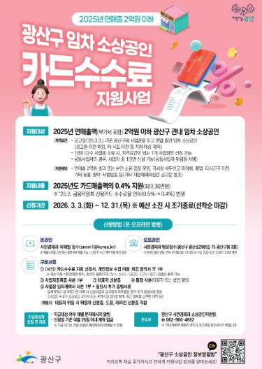 지원 대상은 지난해 연 매출액(부가세 포함) 2억 원 이하의 광산구 내 임차 소상공인을 대상으로 지난해 카드 매출액의 0.4%로 최대 30만 원까지 지원한다.