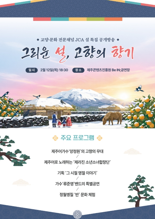 제주콘텐츠진흥원은 제주 교양·문화 전문채널 ‘JCA’를 통해 설 특별 공개방송 '그리운 설, 고향의 향기'를 2월 12일, 오후 6시 30분에 생방송으로 진행한다고 밝혔다.