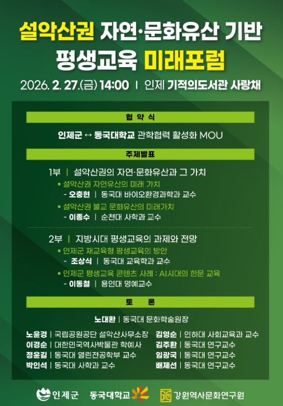 한편, 협약식과 함께 2025년 인제군–동국대 협력사업의 일환으로 '설악산권 자연·문화유산 기반 평생교육 미래포럼'이 개최된다.